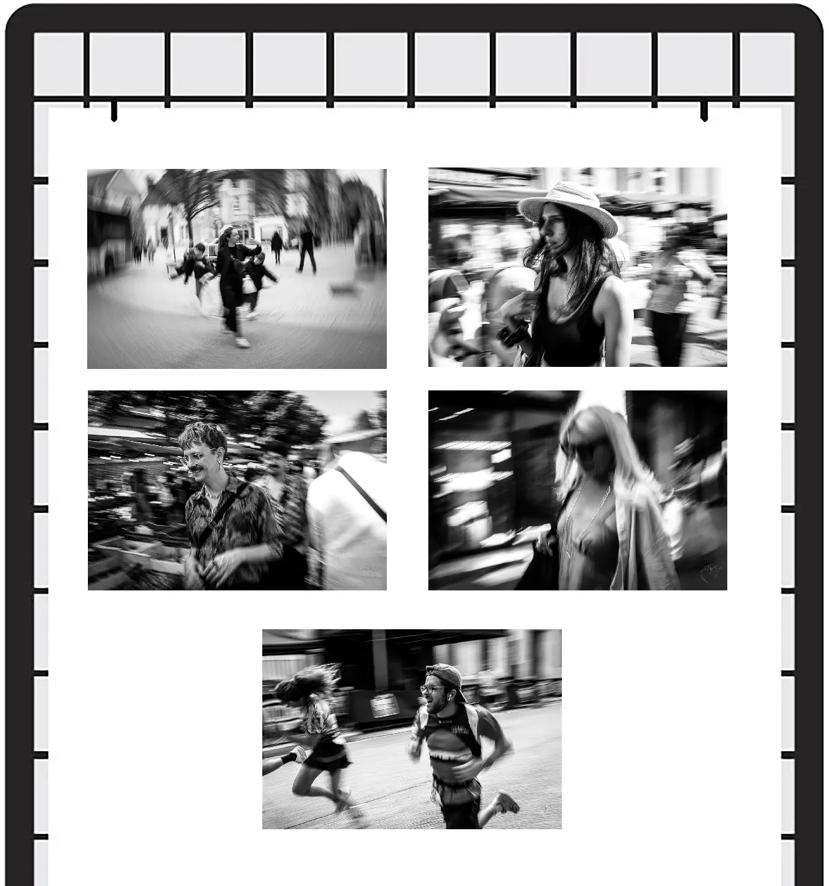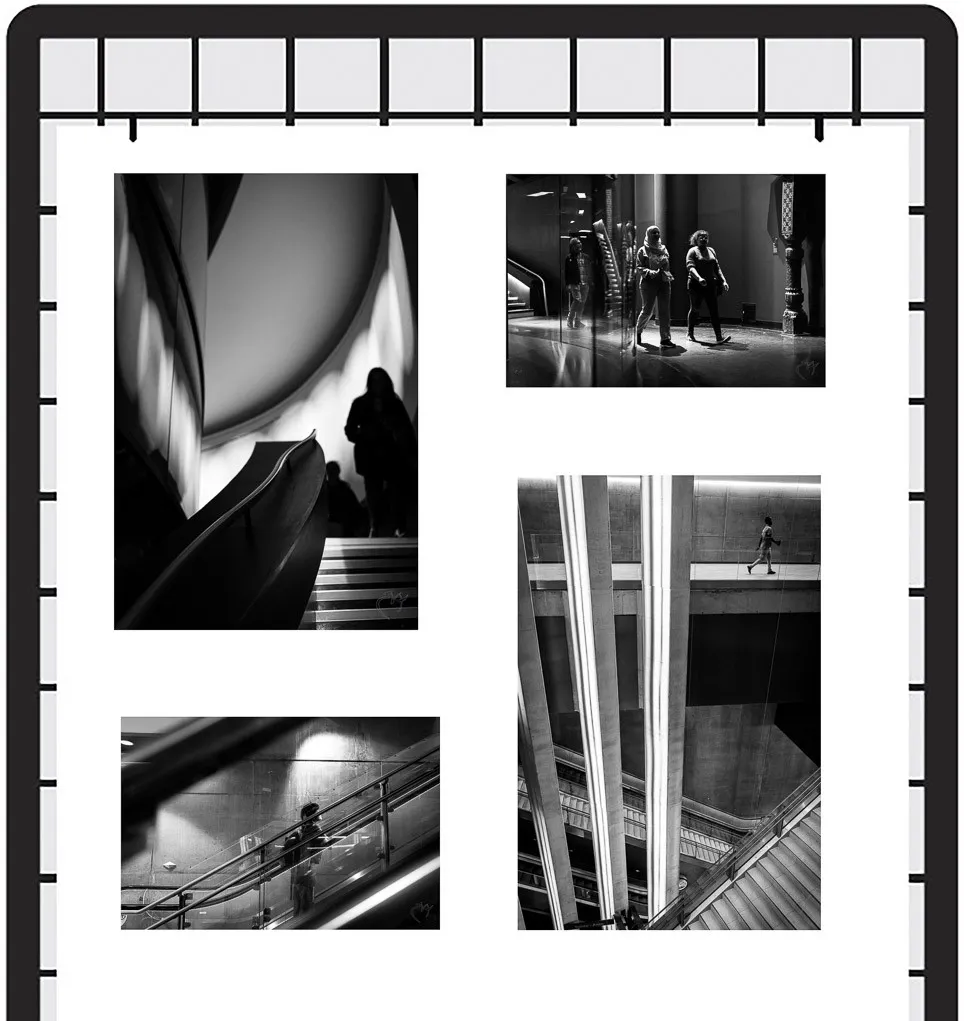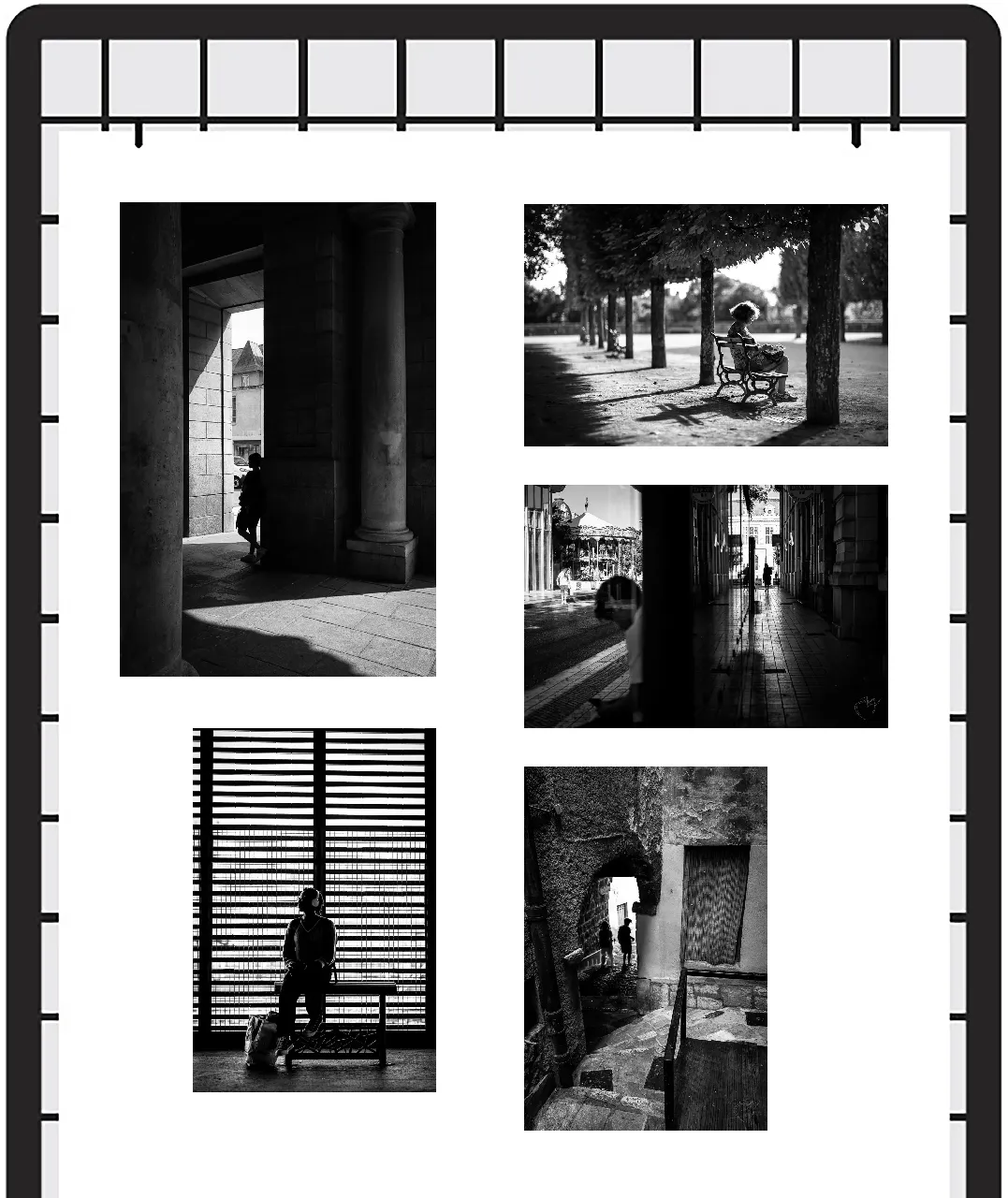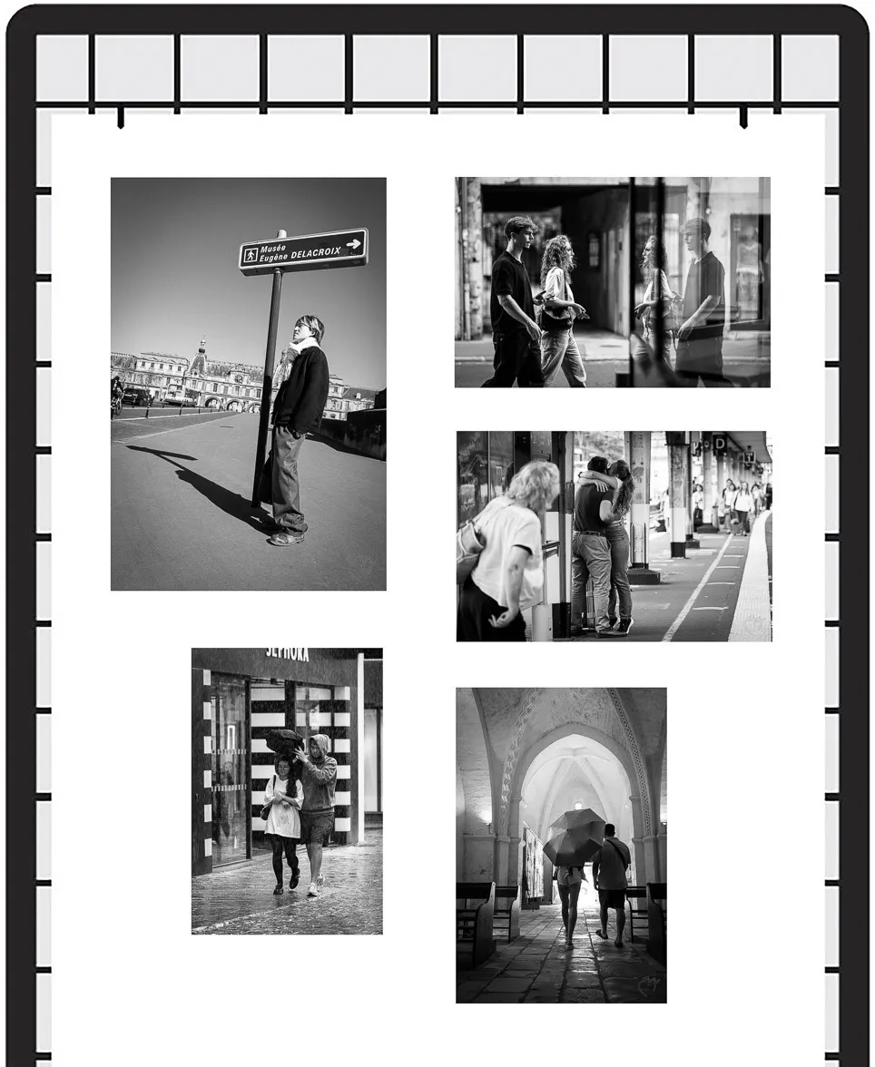 Pour cette exposition j’ai choisi d’explorer les multiples facettes de la photo de rue. Cette série de 36 photographies est une exploration méthodique de l'espace public à travers huit prismes différents :